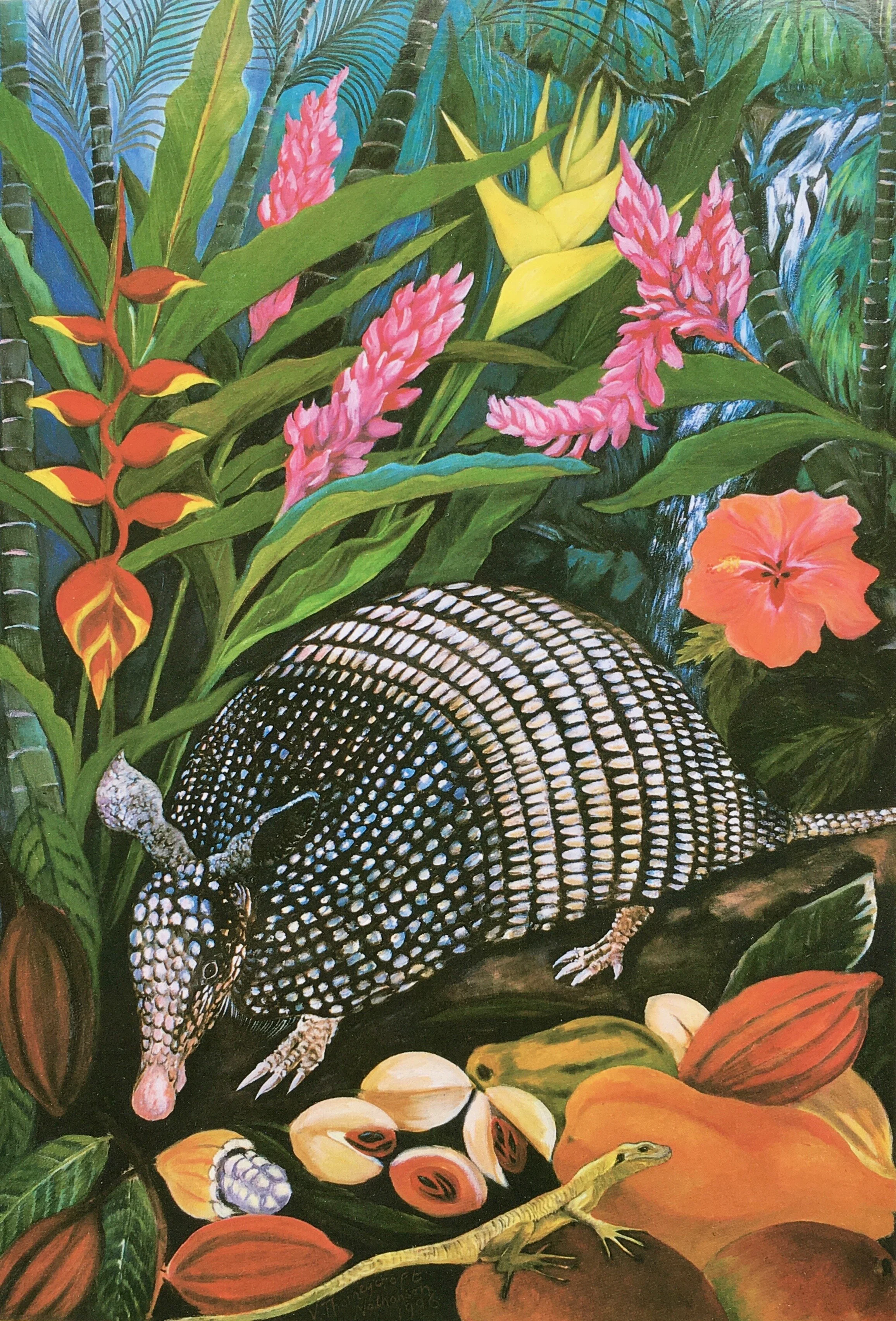 The Armadillo is a symbol of Grenada and in the background are the ginger lilies, heliconia, hibiscus and bamboo I saw in the rainforest. Among the fruit in the foreground is the cocoa and the nutmeg with its covering of mace, both very important crops for the island.