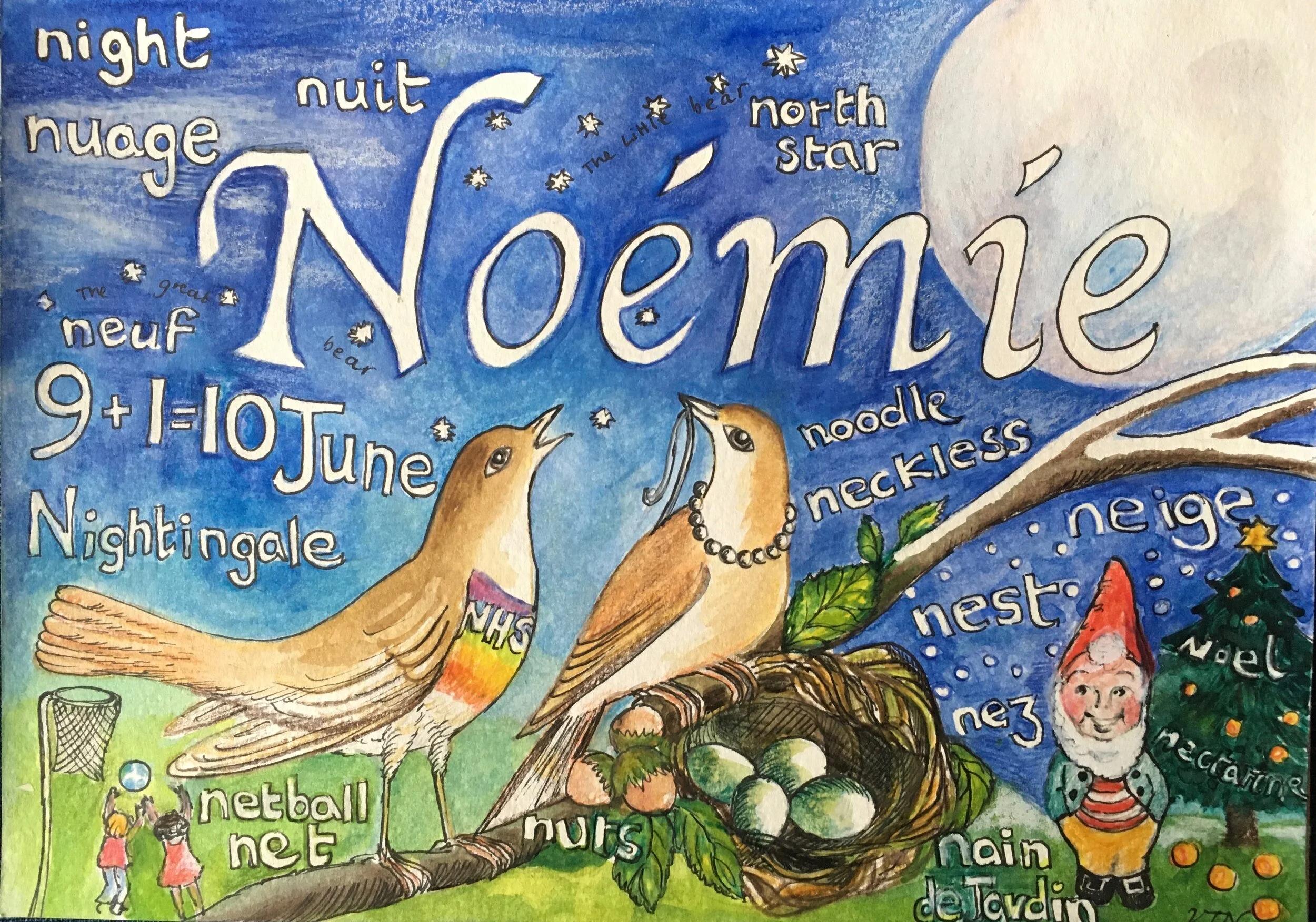 Noémie, watercolour, A special present celebrating a child’s name and all the things that are special to her.